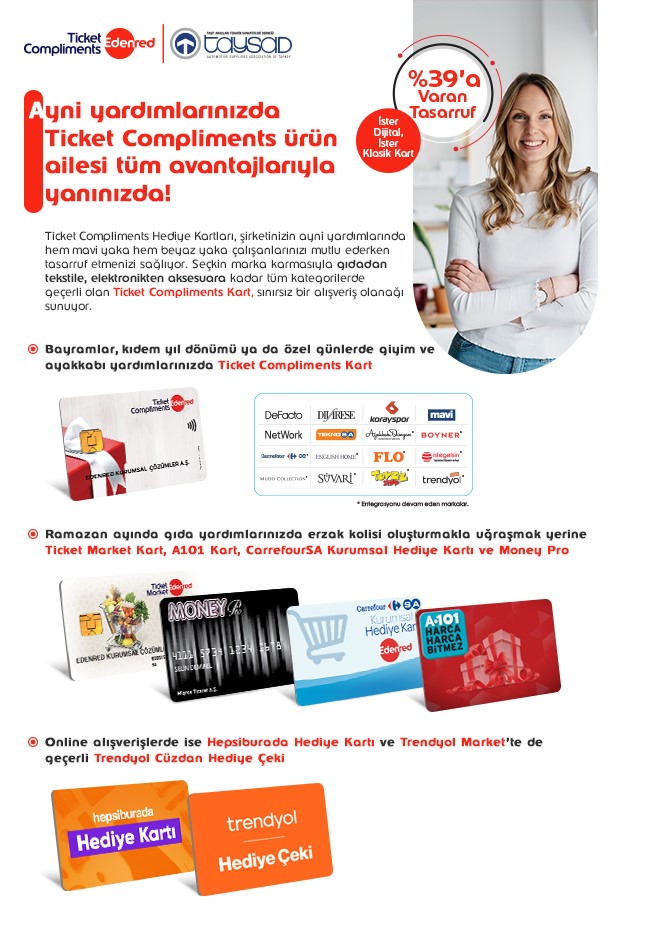 İş ortağımız EDENRED ile yürüttüğümüz ikinci projemiz "Ticket Compliments Hediye Kartı" ile bayramlarda, kıdem, yıl dönümü ya da özel günlerde çalışanlarınıza sağlayacağınız ayni yardımlarınızda Ticket compliments'ın çeşitli marka avantajıyla hem çalışanlarınıza hem de %39'a varan tasarruf oranı ile şirketinize destek olabileceksiniz.